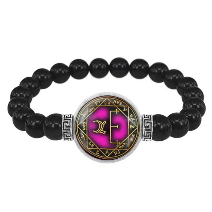Стрейч-браслет из бусин чёрного агата с декоративным элементом под выпуклой стеклянной линзой.