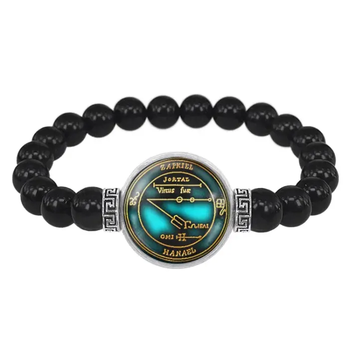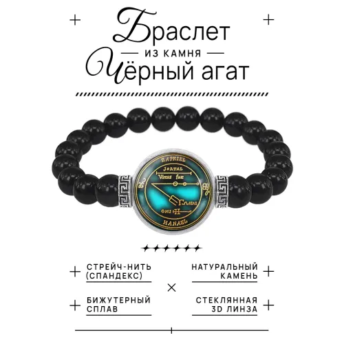 Стрейч-браслет из чёрного агата с декоративным элементом под стеклянной линзой.
