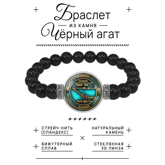 Материал и изготовление: Бусины из чёрного агата диаметром 8 мм, бижутерный сплав с покрытием под серебро, стекло. Декоративный элемент с изображением размещён под выпуклой стеклянной линзой диаметром 20 мм.