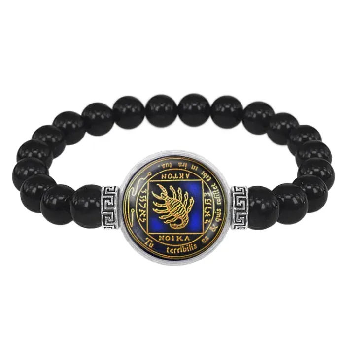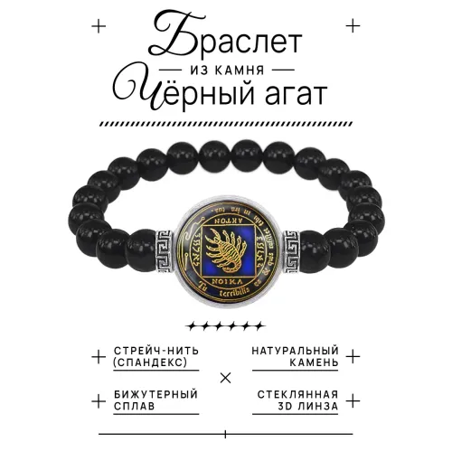 Стрейч-браслет амулет из бусин чёрного агата с центральным элементом под выпуклой стеклянной линзой.