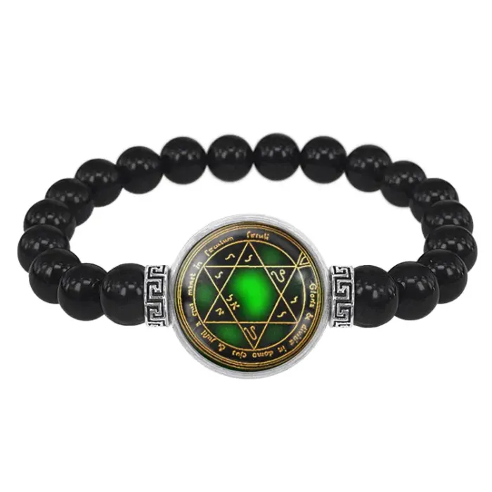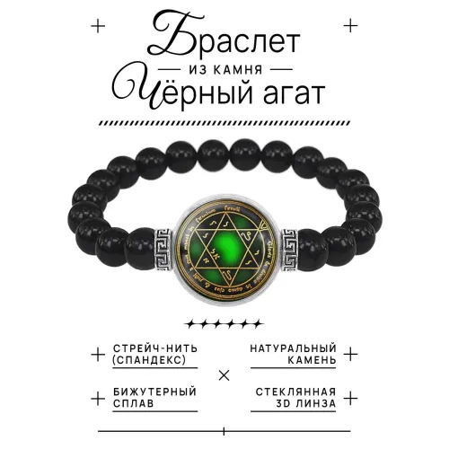 Стрейч-браслет из бусин чёрного агата с декоративным элементом под стеклянной линзой.