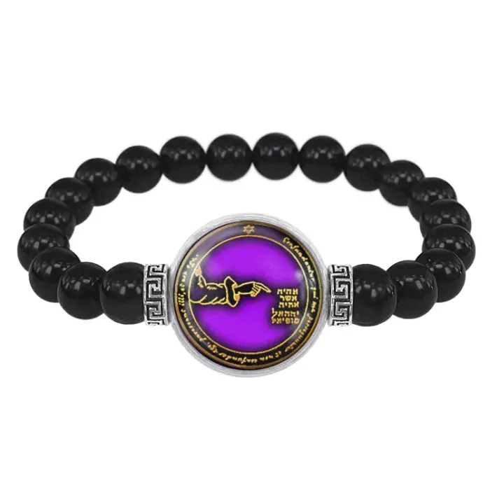 Стрейч-браслет амулет из бусин чёрного агата с декоративным элементом под стеклянной линзой.