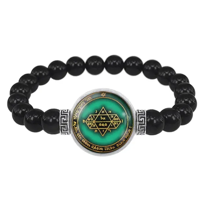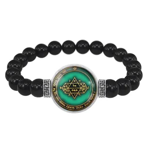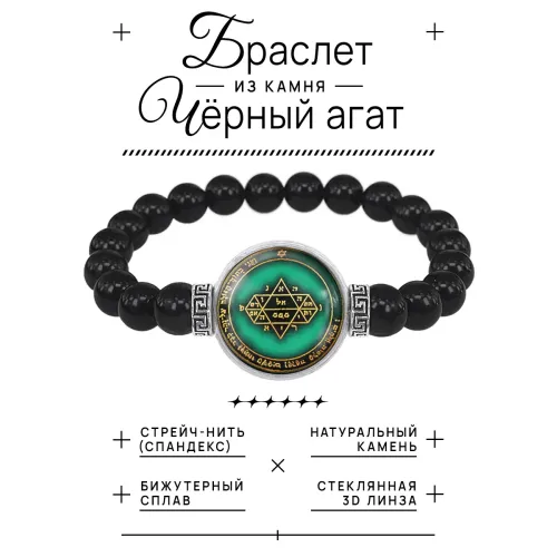 Стрейч-браслет-амулет из бусин черного агата с центральным элементом под выпуклой стеклянной линзой.