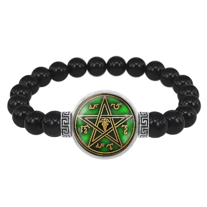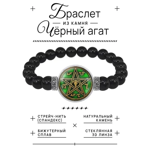 Стрейч-браслет для личного ношения. Изготовлен из бусин чёрного агата и бижутерного сплава, дополнен кулоном с изображением под стеклянной линзой.