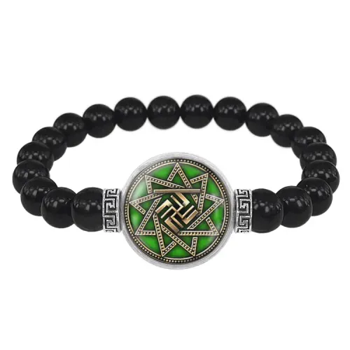 Стрейч-браслет-амулет из бусин черного агата с изображением под выпуклой стеклянной линзой.