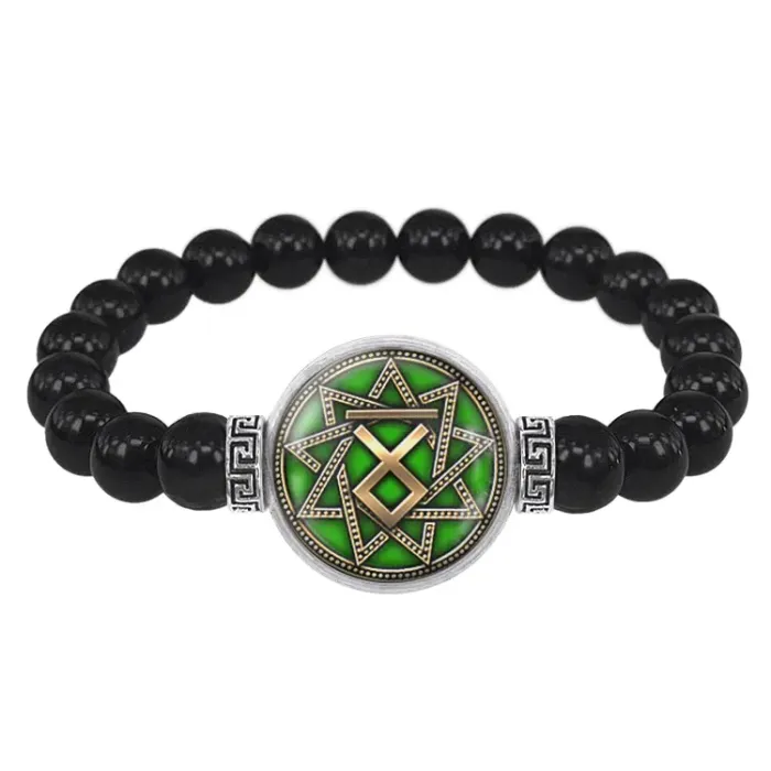 Стрейч-браслет с амулетом Чертог Волка из черного агата и бижутерного сплава с изображением под стеклянной линзой.