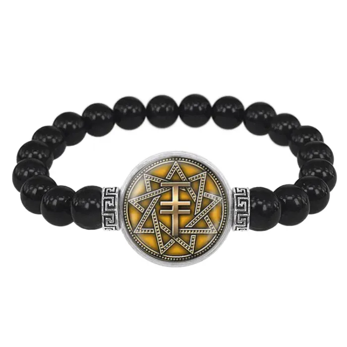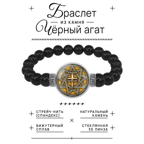 Стрейч-браслет из черного агата с центральным элементом под выпуклой стеклянной линзой.