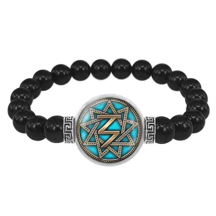 Размеры и комплектация: Диаметр бусин 8 мм, диаметр линзы 20 мм, внутренний диаметр браслета около 5.5 см. Упаковка: прозрачный полипропиленовый пакет.