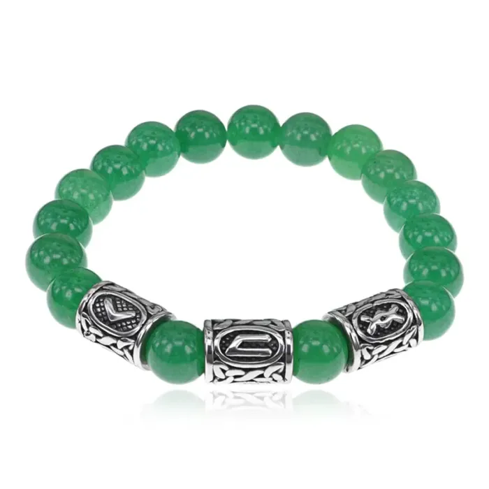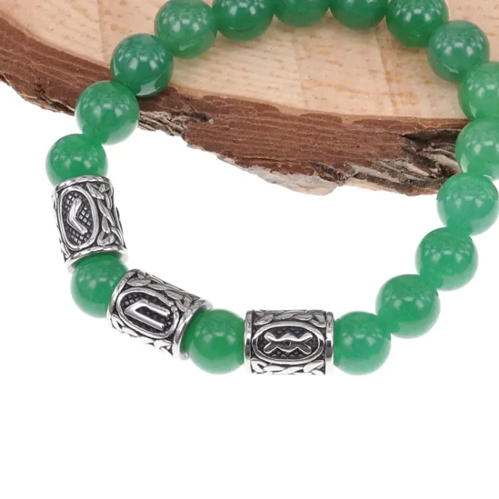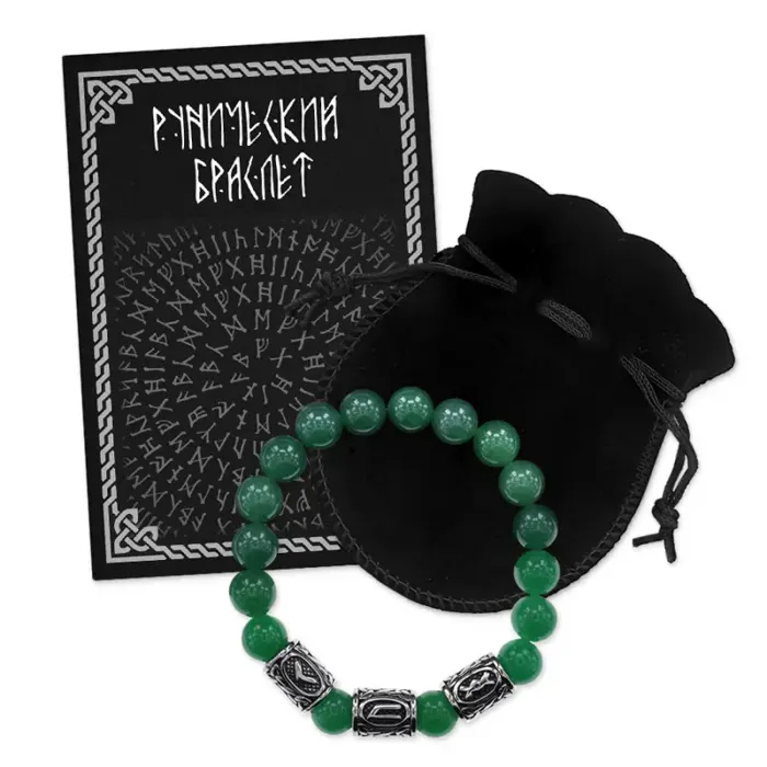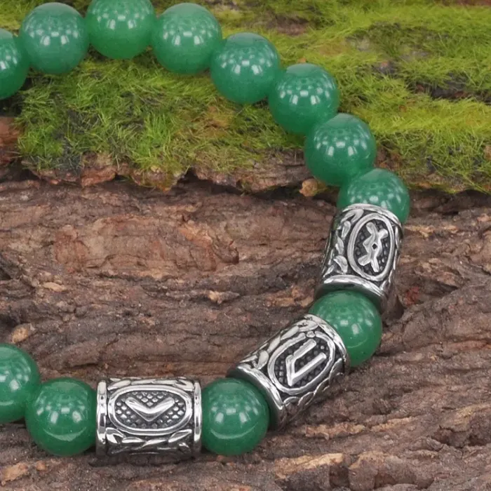 Стрейч-браслет ручной работы из натурального нефрита и рунических бусин из нержавеющей стали.