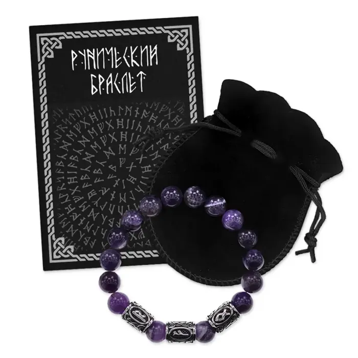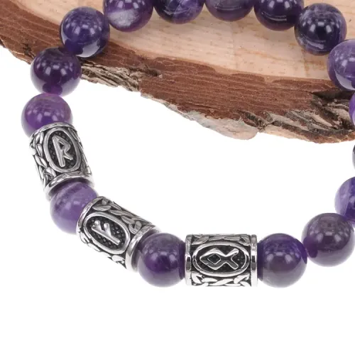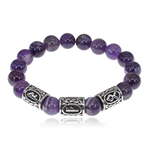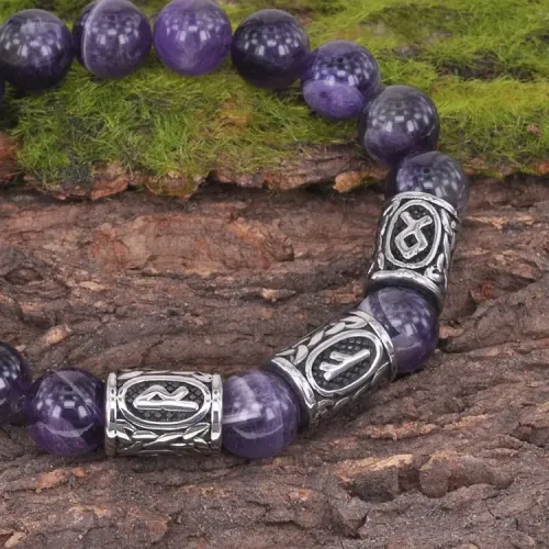Стрейч-браслет ручной работы из натурального аметиста диаметром 10 мм и рунических бусин из нержавеющей стали.