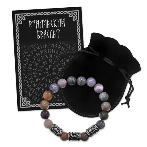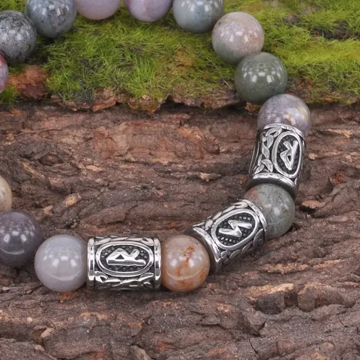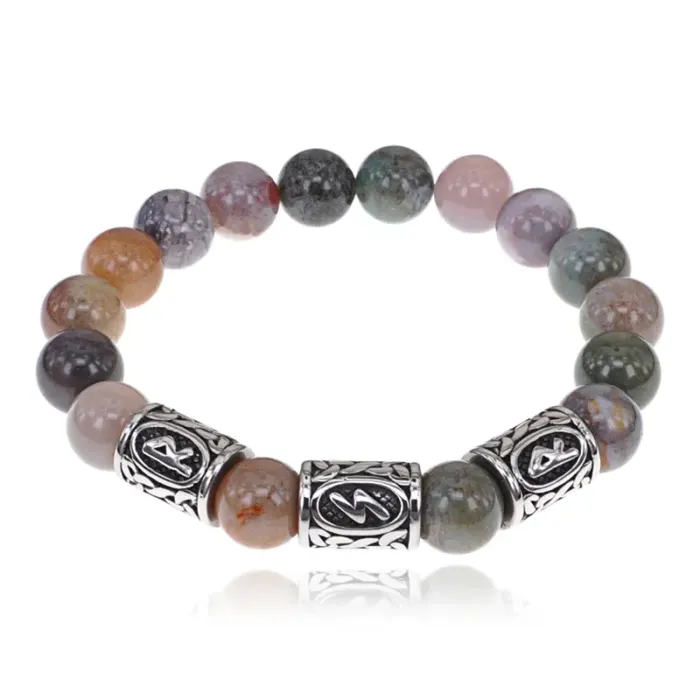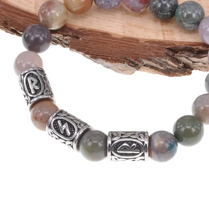 Стрейч-браслет ручной работы из натуральной яшмы диаметром 10 мм и рунических бусин из нержавеющей стали.