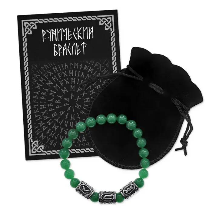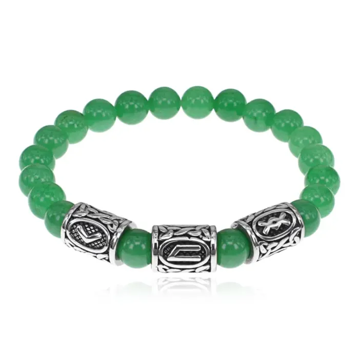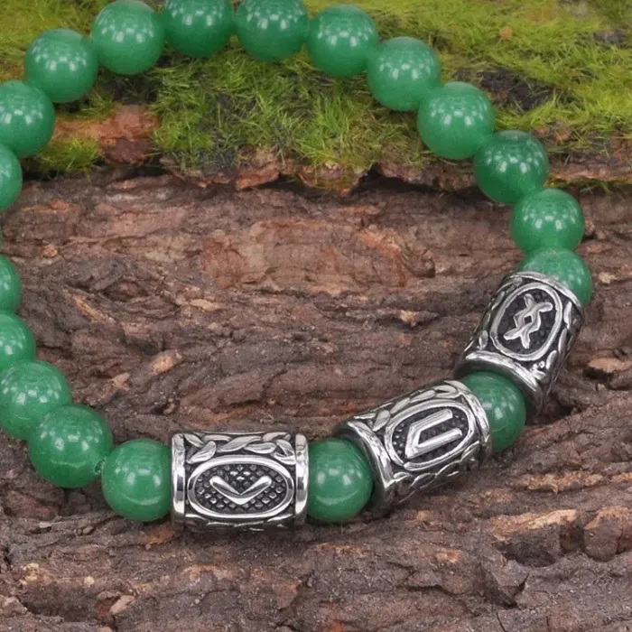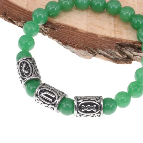 Стрейч-браслет из натурального нефрита и нержавеющей стали с руническими символами.
