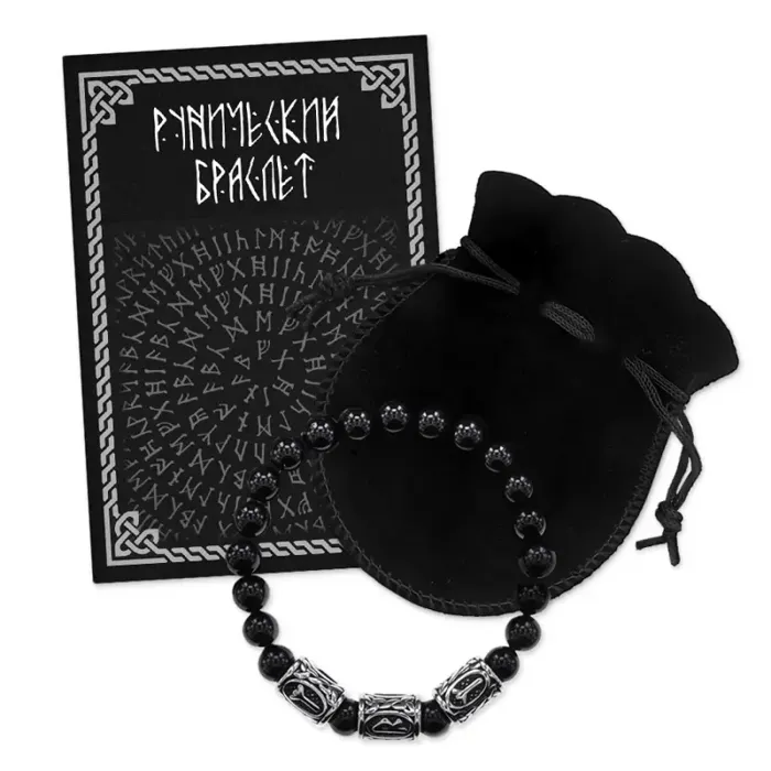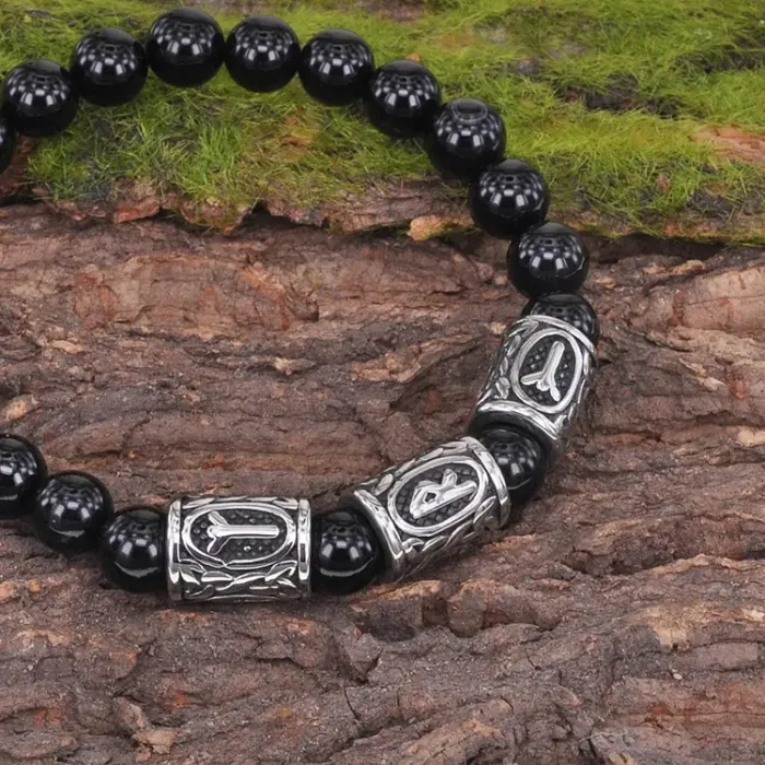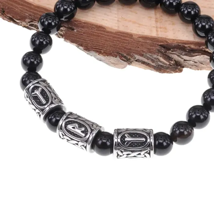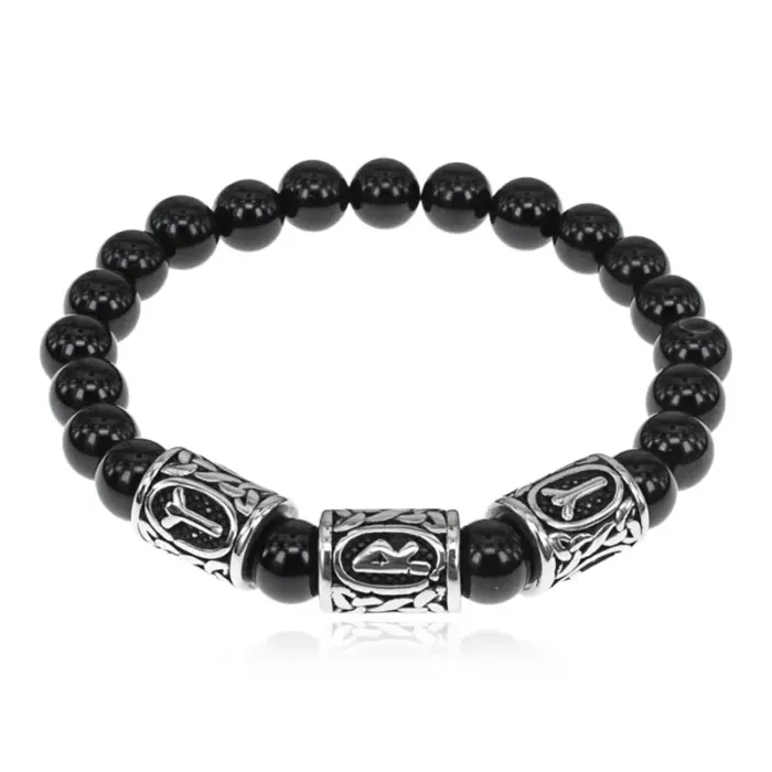 Стрейч-браслет ручной работы из натурального камня черный агат диаметром 8 мм и рунических бусин из нержавеющей стали.