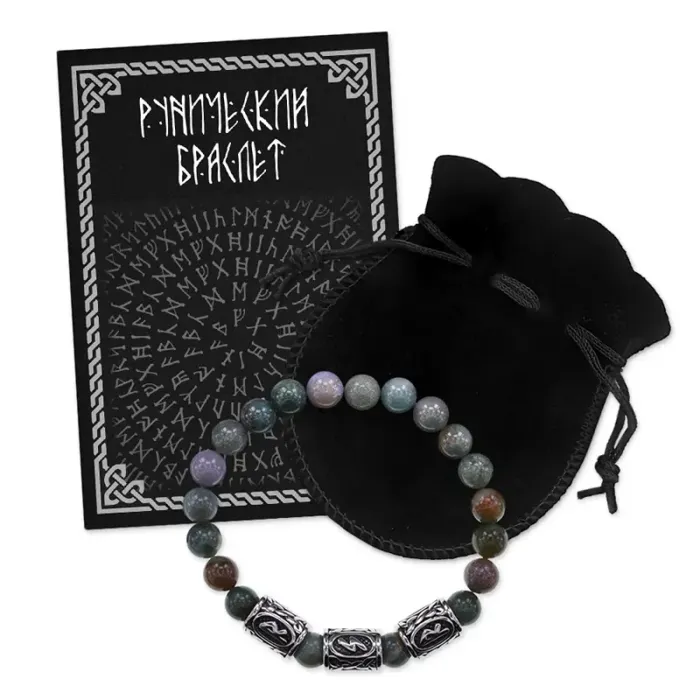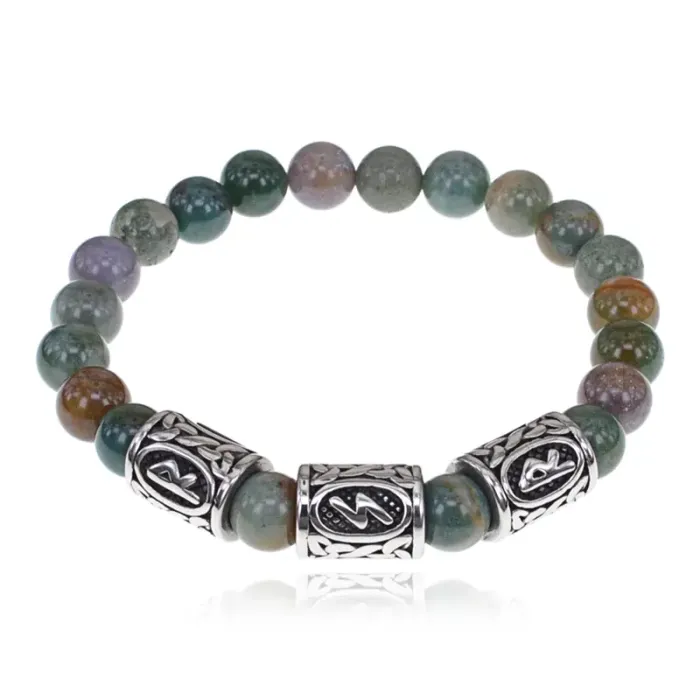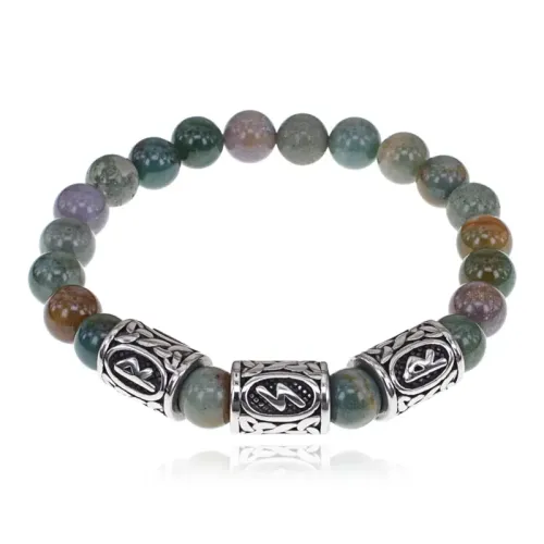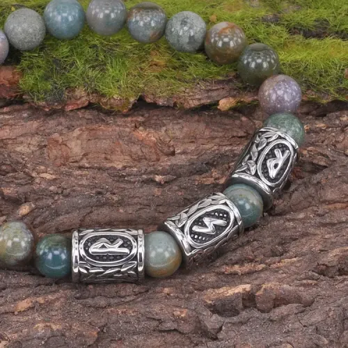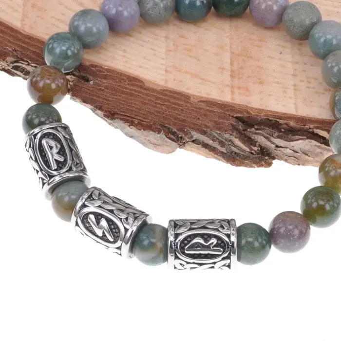 Стрейч-браслет ручной работы из натуральной яшмы диаметром 8 мм и рунических бусин из нержавеющей стали.