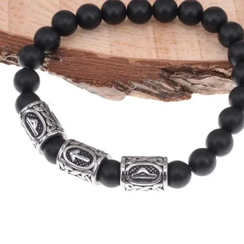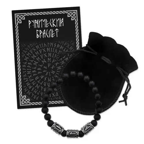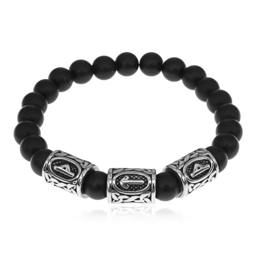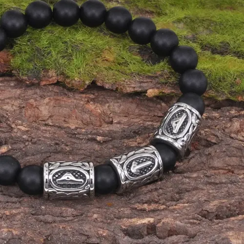Стрейч-браслет ручной работы из синтетического камня шунгит диаметром 8 мм и бусин из нержавеющей стали с руническими символами.
