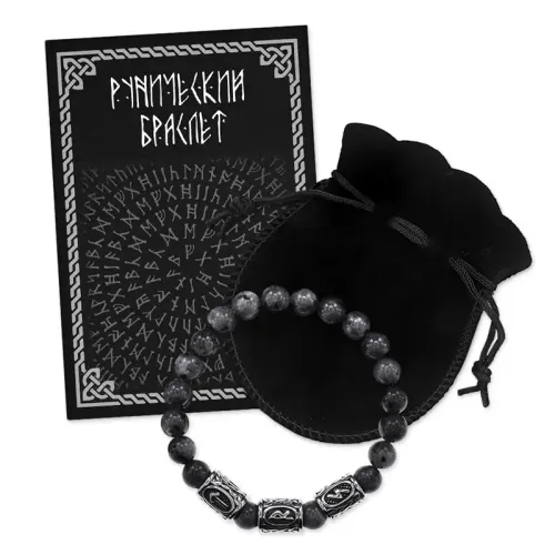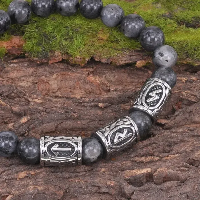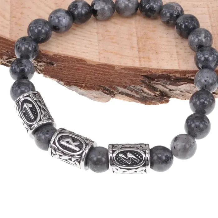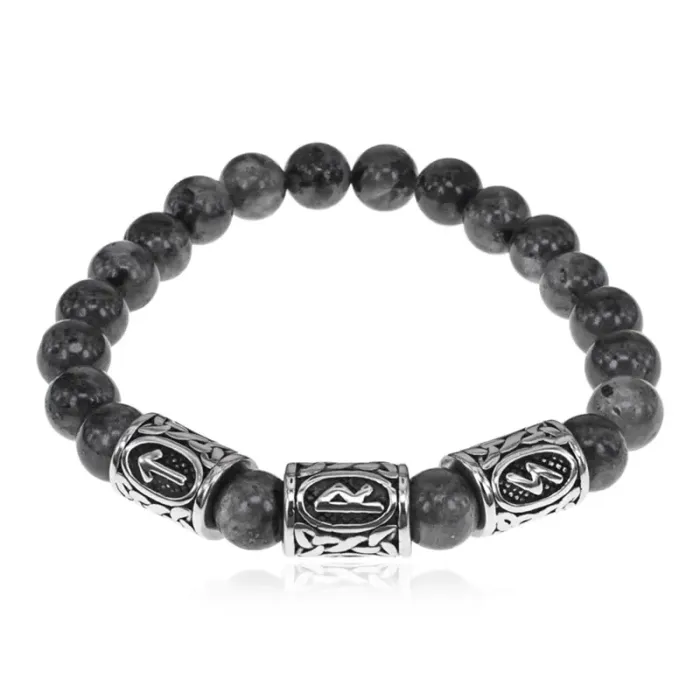 Стрейч-браслет ручной работы из натурального камня лабрадор диаметром 8 мм и рунических бусин из нержавеющей стали.