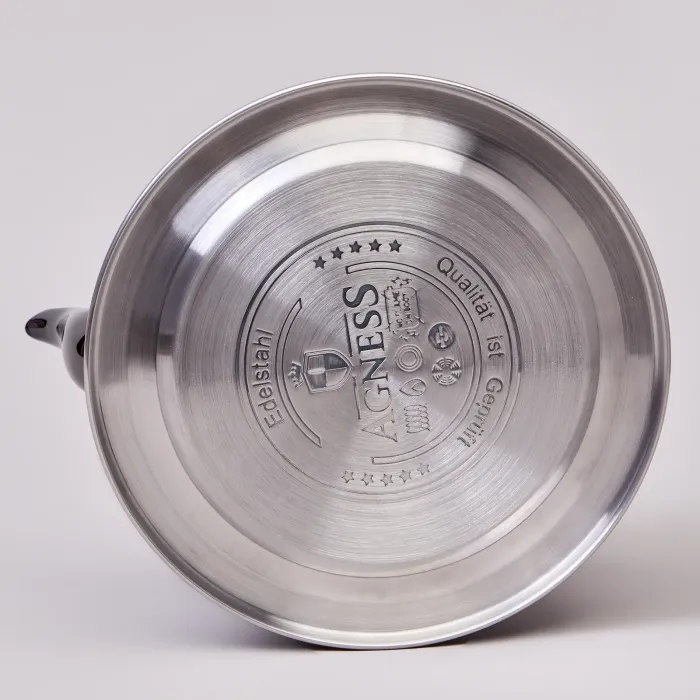 Чайник объёмом 3 литра с индукционным капсульным дном и складывающейся ручкой от Agness сочетает в себе надёжность, функциональность и стильный дизайн. Универсальный внешний вид позволяет ему гармонично вписаться в любой интерьер кухни.