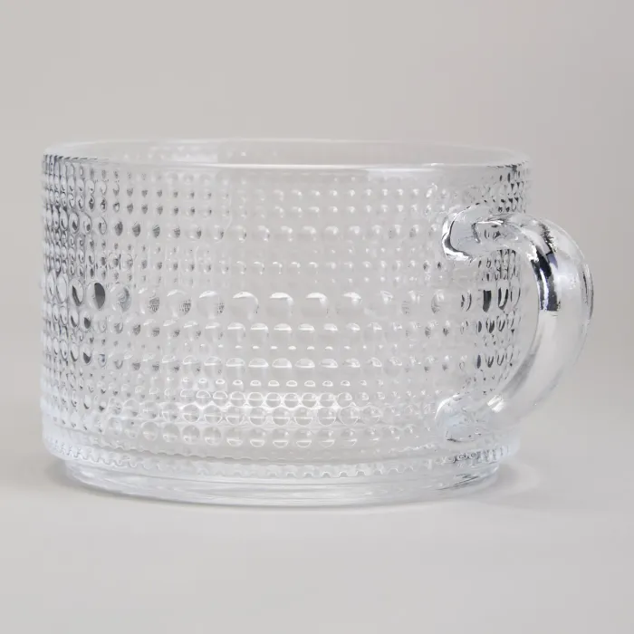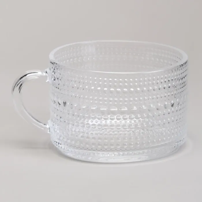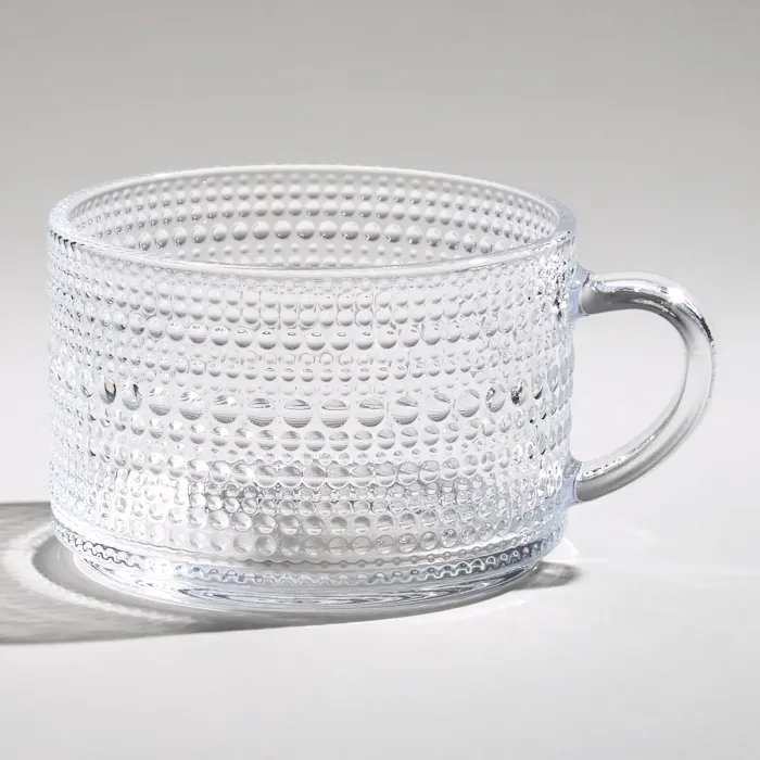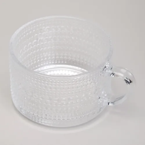 Кружка выполнена из прозрачного стекла, что позволяет визуально оценивать цвет и консистенцию напитка. Поверхность украшена декоративными узорами. Форма с удобной ручкой обеспечивает комфортное использование.