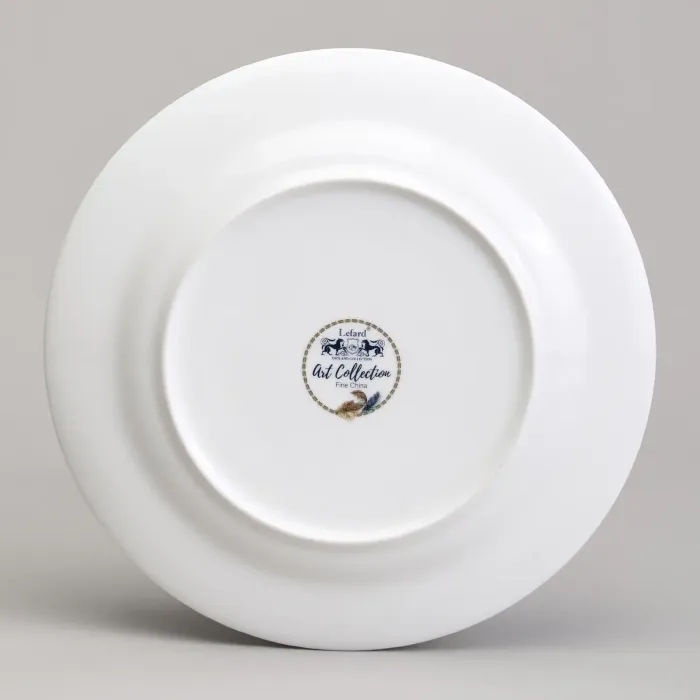 Тарелки изготовлены из тонкостенного фарфора высокого качества, что обеспечивает прочность и гигиеничность. Дизайн сочетает растительные и животные элементы, характерные для классического английского стиля. Продукция сертифицирована для безопасного контакта с пищевыми продуктами.