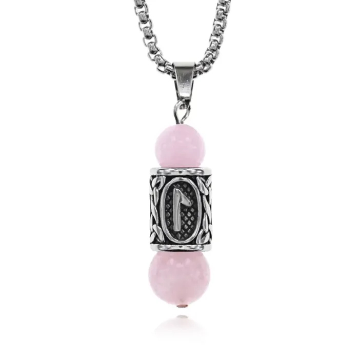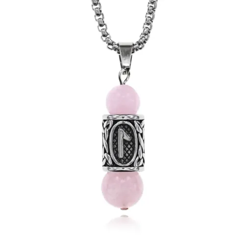 Кулон-амулет с руной Лагуз из нержавеющей стали и натурального розового кварца.