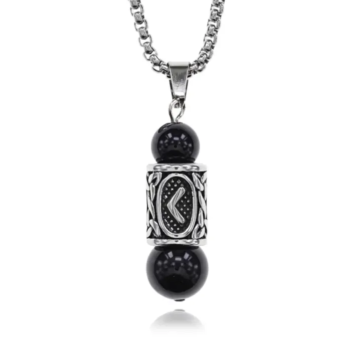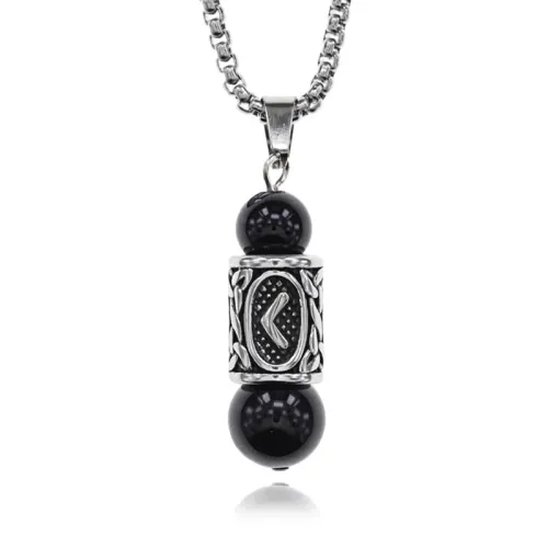 Кулон-амулет с руной Кеназ из нержавеющей стали и натурального черного агата.
