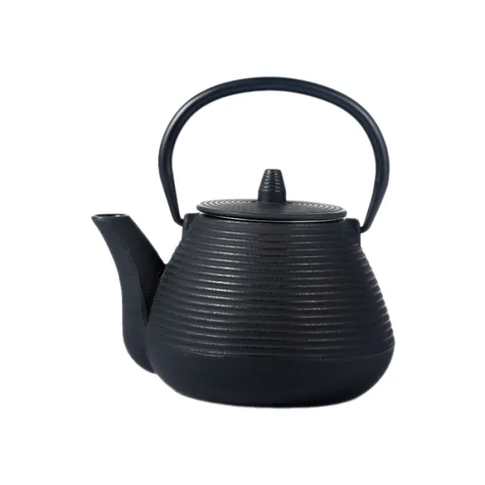 Чайник изготовлен из чугуна, материала с высокой теплоёмкостью и прочностью, устойчивого к коррозии. Конструкция включает носик для удобного наливания напитка и ручку для безопасного использования.