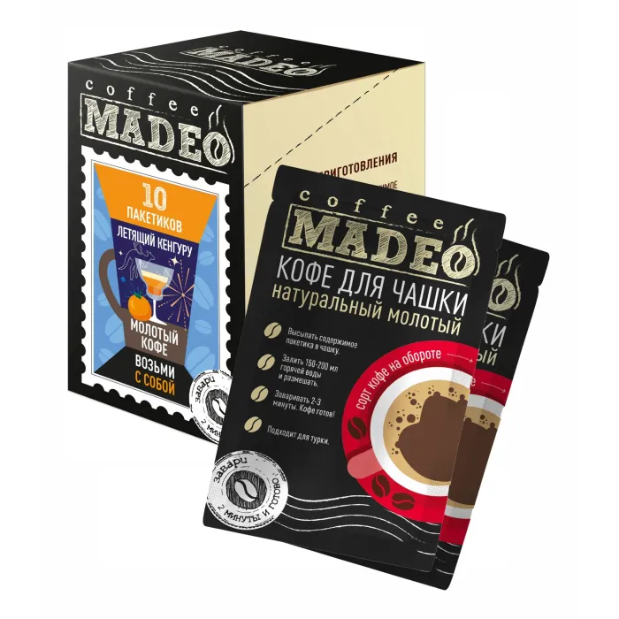 Десертный молотый кофе Madeo «Летящий кенгуру» предлагает уникальный вкусовой опыт с тропическими нотами. В основе — арабика из стран Латинской Америки, обжаренная до средней степени для сбалансированного профиля с выраженной кислотностью, высокой плотностью и средней горечью. Вкус раскрывается яркими акцентами мандарина, нежным кокосом, сливочной мягкостью и тёплыми ромовыми оттенками.