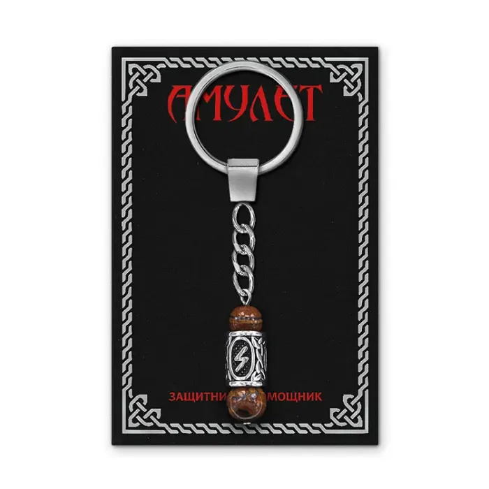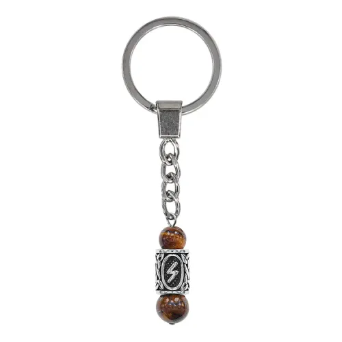 Брелок-амулет из нержавеющей стали с натуральным камнем тигровый глаз и символикой руны Соулу.