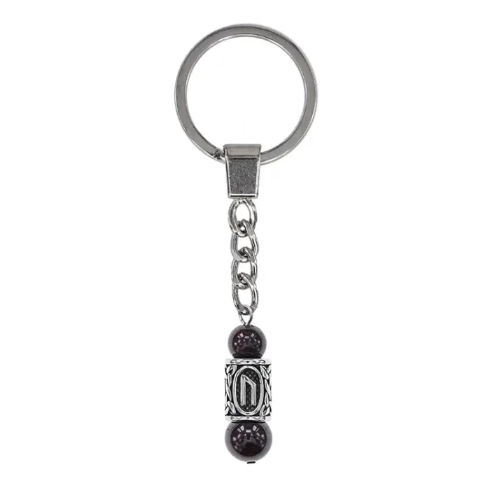 Брелок-амулет из нержавеющей стали с руной Уруз и натуральным гранатом.