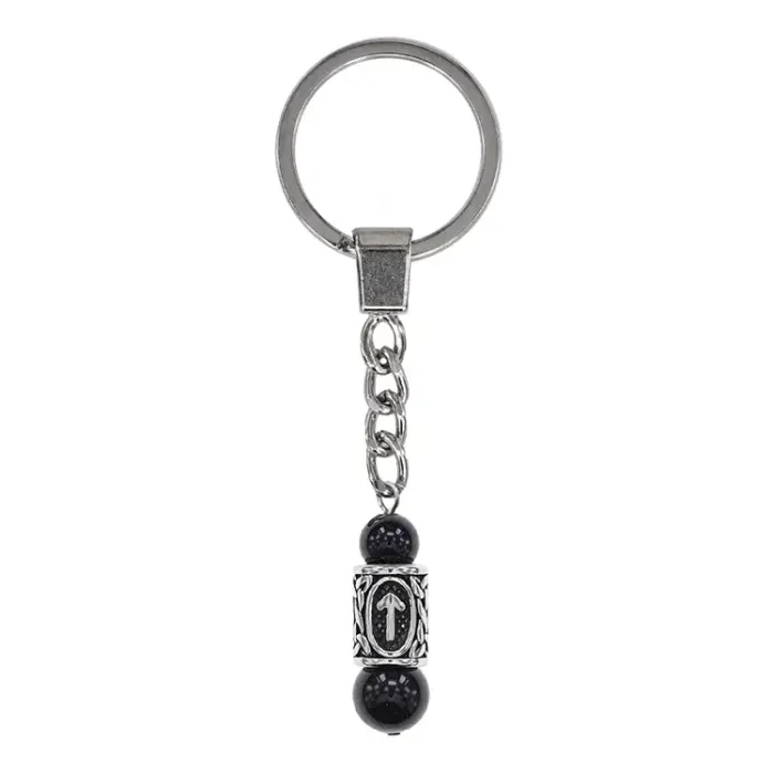 Брелок-амулет с руной Тейваз из нержавеющей стали и чёрного агата.
