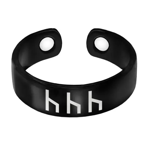 Магнитное кольцо из бижутерного сплава с лазерной гравировкой в виде руны. Имеет безразмерную форму.