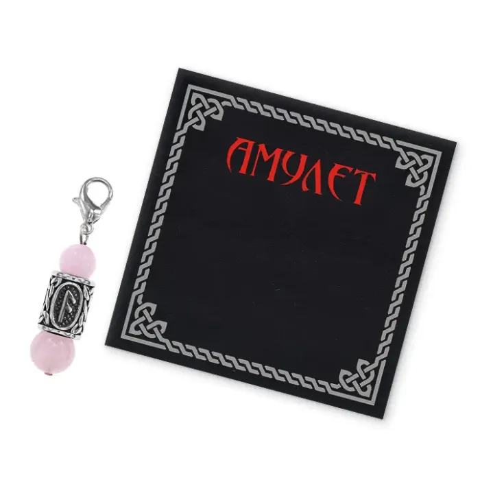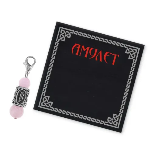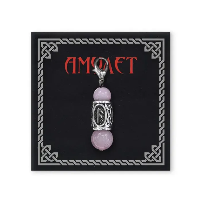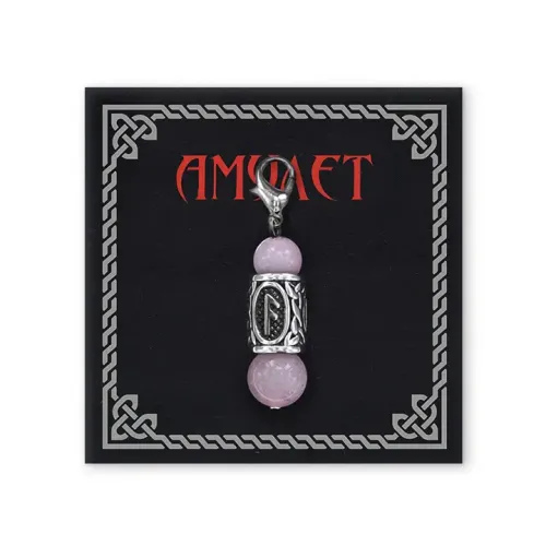 Брелок-амулет Ансуз из нержавеющей стали с натуральным розовым кварцем и руническим символом.