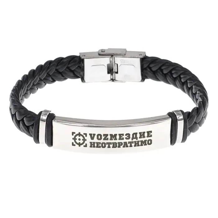 Кожаный браслет с гравировкой «Возмездие неотвратимо».