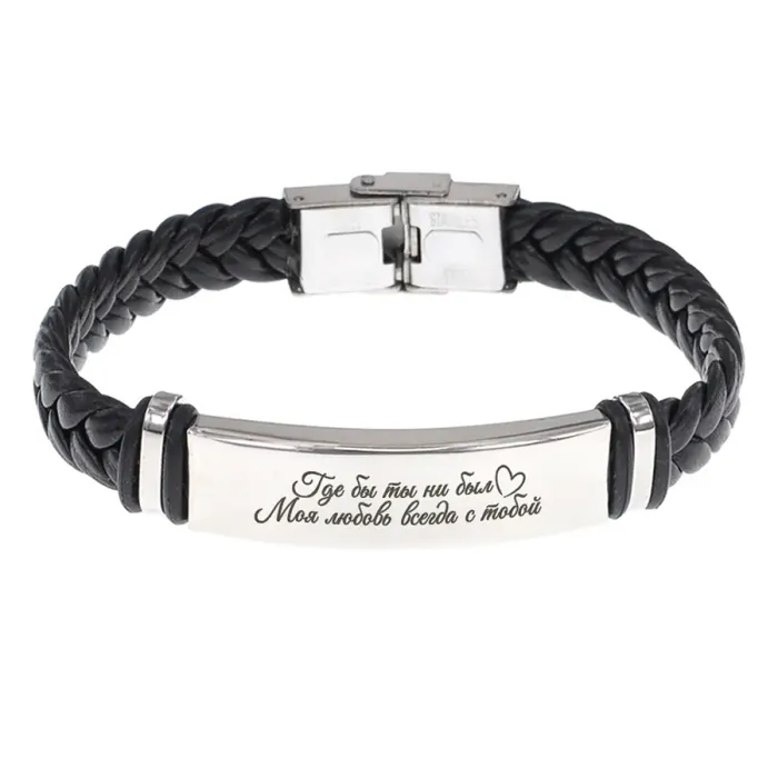 Кожаный браслет с гравировкой «Где бы ты ни был». Плетёный аксессуар из кожи и нержавеющей стали.