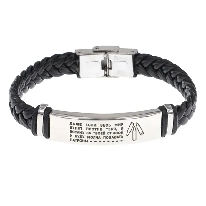 Кожаный браслет с гравировкой «Даже если весь мир против». Плетёный аксессуар из кожи и нержавеющей стали.