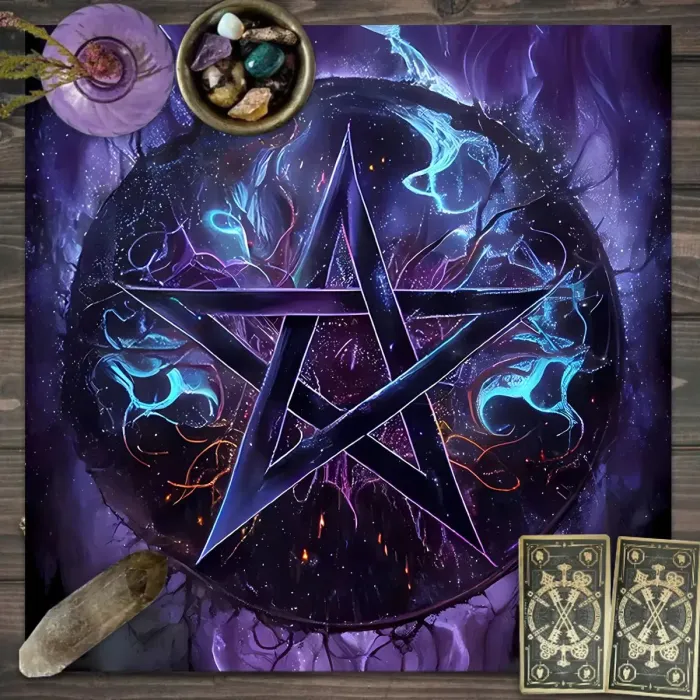 Скатерть для гадания Пентаграмма — это уникальный аксессуар, который помогает создать атмосферу мистики и волшебства во время ритуалов. Изготовленная из качественного полиэстера, она обладает прочностью и долговечностью.