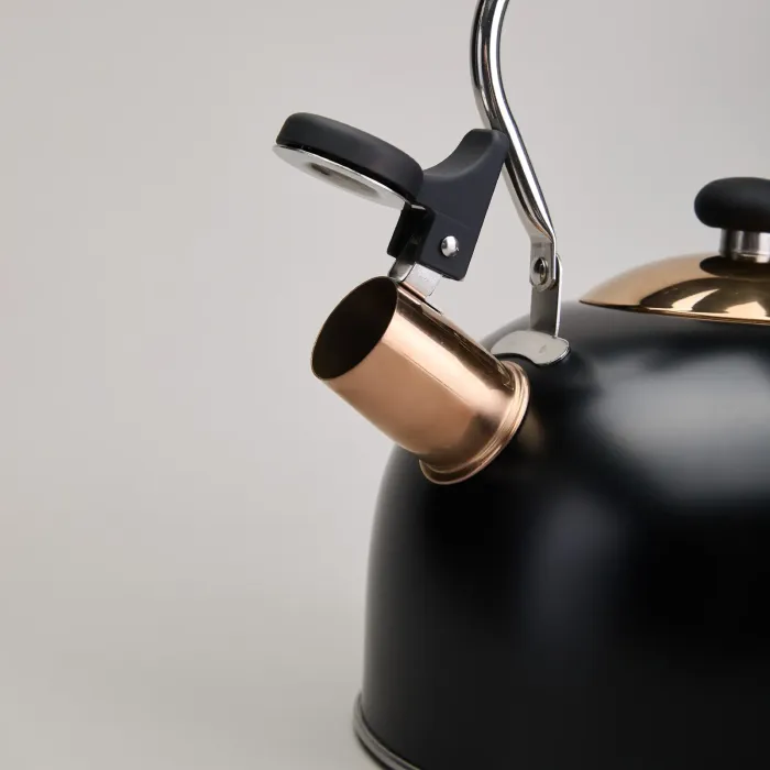 Корпус чайника выполнен из нержавеющей стали толщиной 0,4 мм. Конструкция включает носик с клапаном для удобного наливания и складывающуюся ручку для компактного хранения. Встроенный свисток сигнализирует о закипании воды. Жаропрочное покрытие нанесено на внешнюю поверхность изделия.