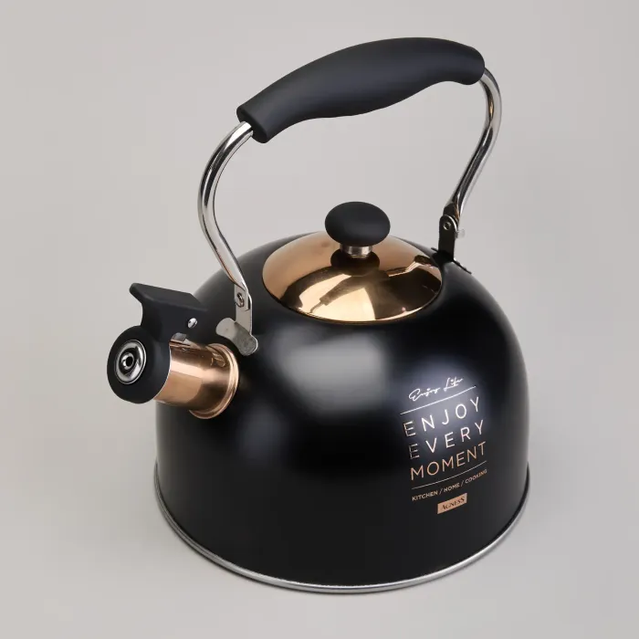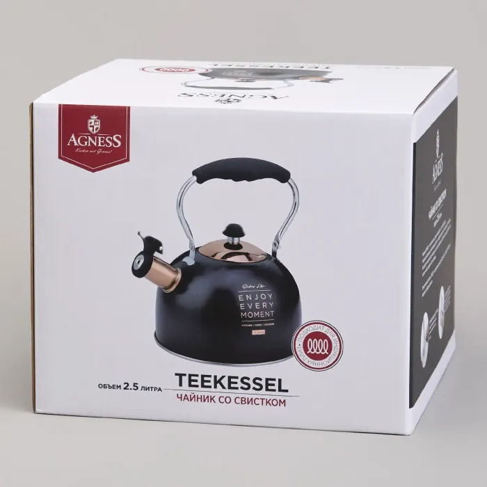 Чайник со свистком объёмом 2,5 литра от Agness предназначен для кипячения воды на всех типах плит, включая индукционные. Основное преимущество — изготовление из нержавеющей стали, что обеспечивает прочность и гигиеничность.