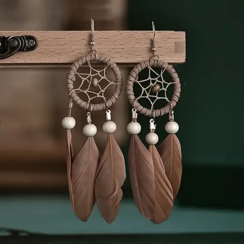 Серьги Ловец снов с перьями, 13х3х1см, цвет коричневый SE095-06