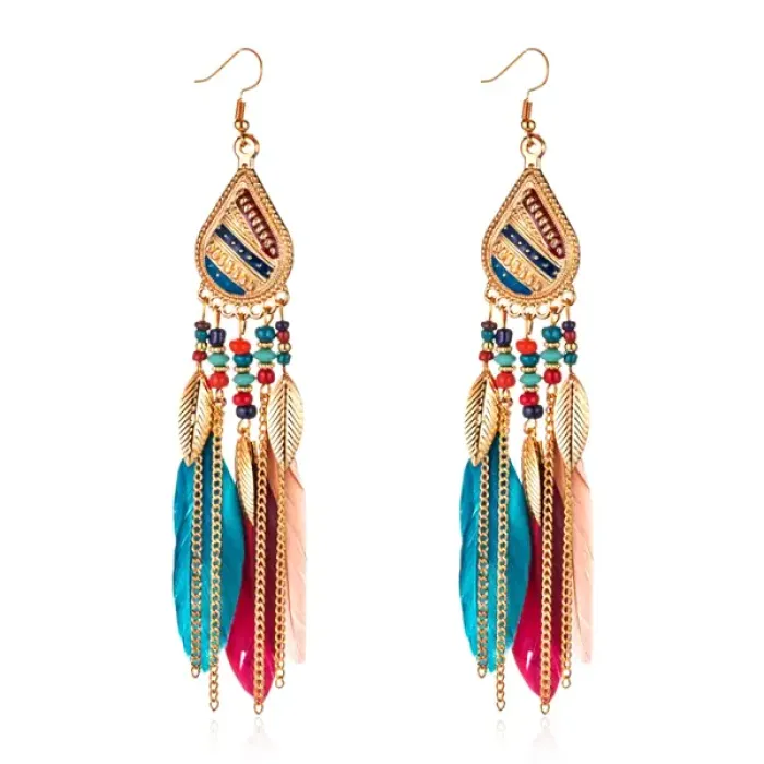 Серьги из бижутерного сплава в форме капли с декором из бисера и перьев.