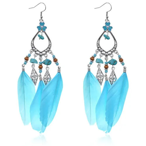 Серьги Капля с бирюзой и перьями, 13х2х1см SE325