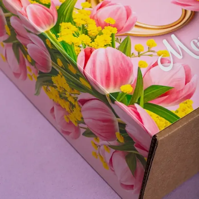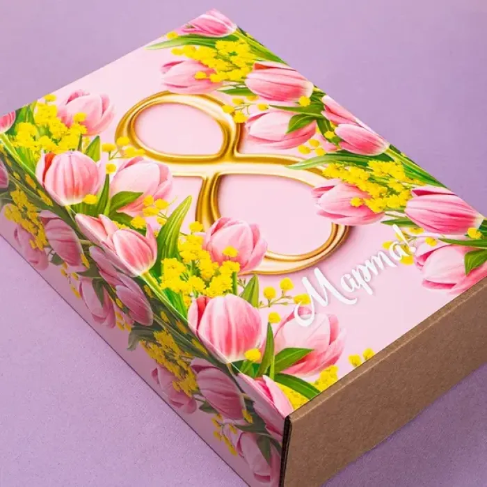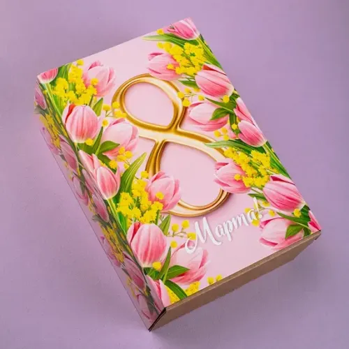 Картонный шубер «8 Марта. Тюльпаны» предназначен для упаковки подарочных наборов из шести стандартных банок. Дизайн с розовым фоном и изображением тюльпанов ориентирован на весенние праздники.