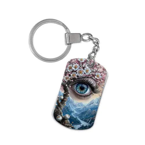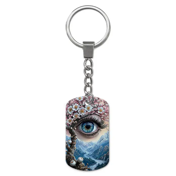 Двухсторонний брелок-жетон для ключей из алюминиевого сплава с цветным изображением сакуры и глаза.