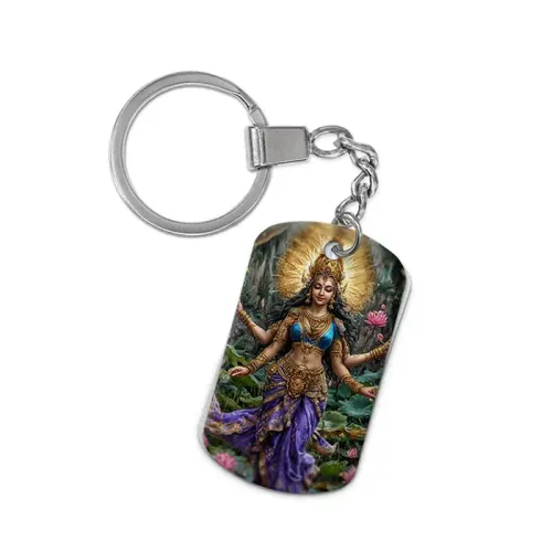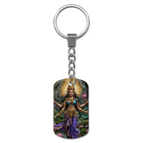 Двухсторонний брелок-жетон с цветным изображением богини Лакшми. Изготовлен из алюминиевого сплава.