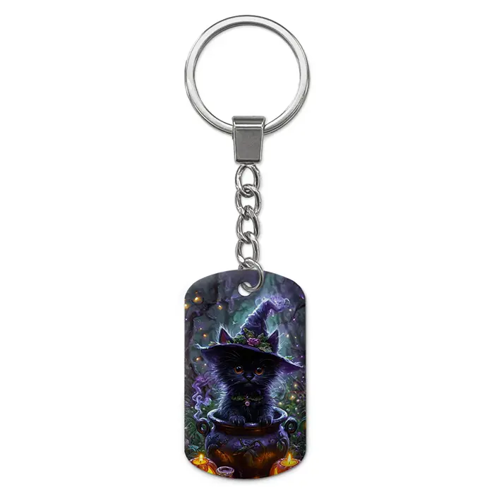 Брелок-жетон с изображением кота в стиле Хэллоуина. Изготовлен из алюминиевого сплава, имеет двусторонний цветной дизайн.