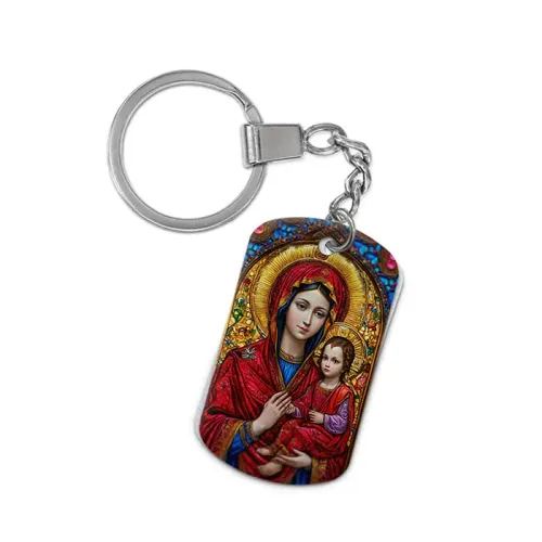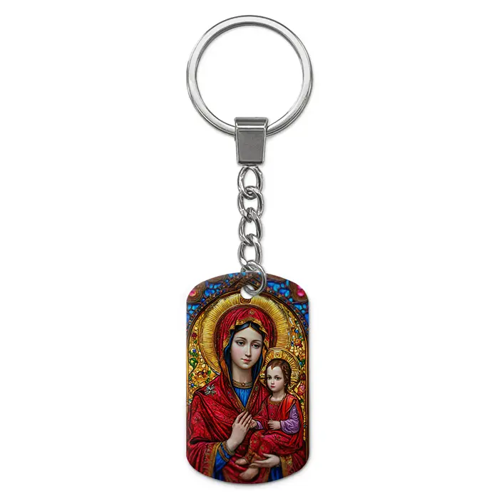 Брелок-жетон с изображением Девы Марии и Иисуса. Изготовлен из алюминиевого сплава, имеет двухстороннее цветное изображение.