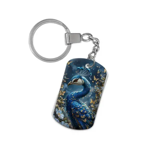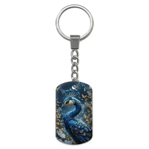 Брелок-жетон для ключей из алюминиевого сплава с двухсторонним цветным изображением павлина.