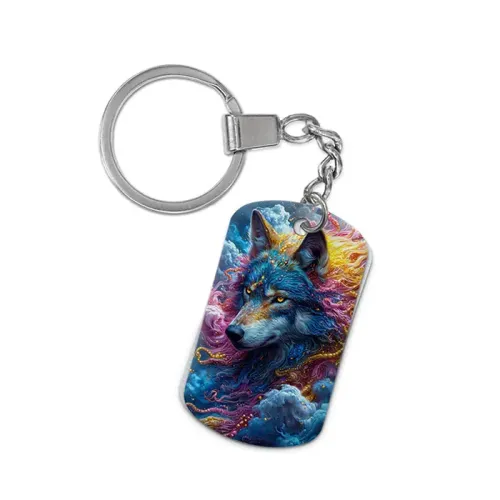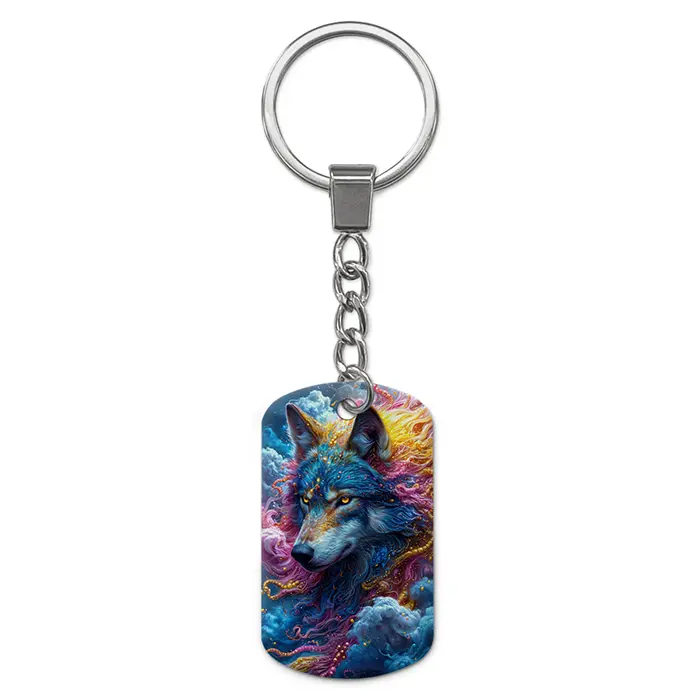 Брелок-жетон из алюминиевого сплава с двусторонним цветным изображением волка в сюрреалистическом стиле.