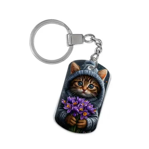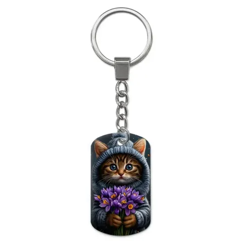 Брелок-жетон с двусторонним цветным изображением котёнка с букетом.