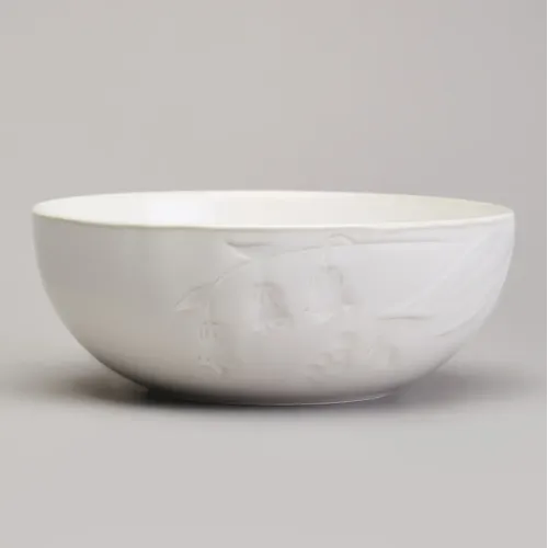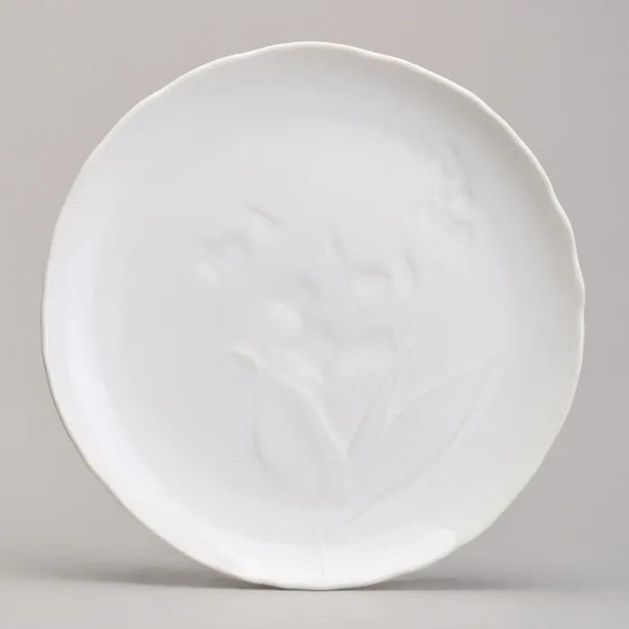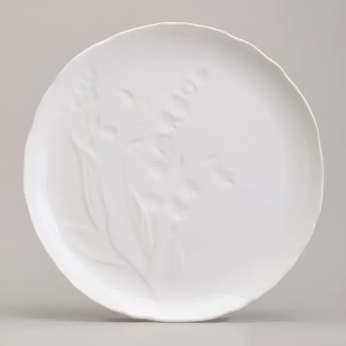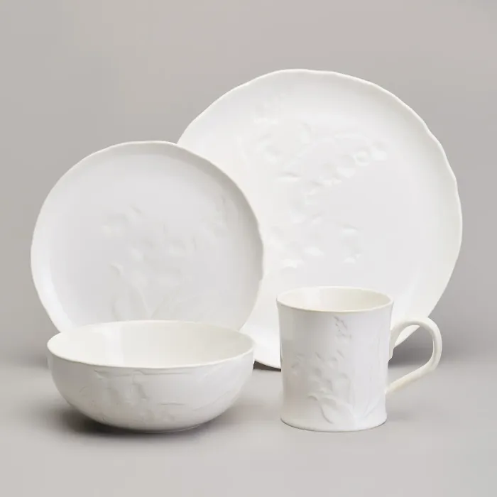 Набор произведён из высококачественного фарфора, что обеспечивает его прочность и долговечность. Белоснежная основа украшена декором в виде рисунка ландышей. В комплектацию входят тарелки для первых и вторых блюд, а также чашки с блюдцами, необходимые для сервировки.